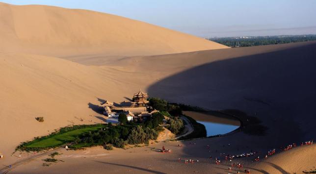 鸣沙山月牙泉:月牙泉南北长近100米,东西宽约25米,泉水东深西浅,最深处约5米,弯曲如新月,因而得名,有“沙漠第一泉”之称。