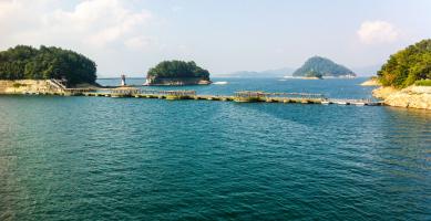 大洋湖面如镜,对面群山环抱,巍峨挺拔,郁郁葱葱的树木遮盖了整座山,还悄悄跑到了湖中,惹得湖水都沾上了一丝丝绿。