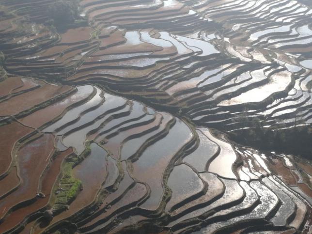 上帝打翻的调色盘,12月,元阳梯田里已全部灌满水,灌水后的梯田仿佛片片明镜,在蓝天的映衬下焕发出蓝宝石般的“蓝调”。哈尼梯田景观是哈尼族等各民族经过上千年开垦和耕种,漫山的水稻梯田与云海、森林、村庄组成一幅奇妙的图画。