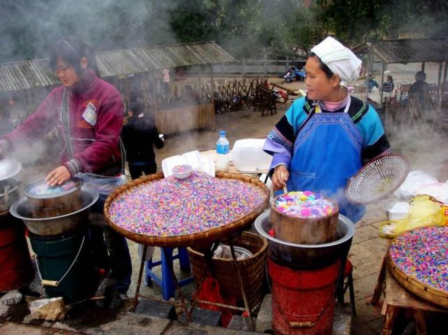 花米饭是布依人的专利品。将米饭染得色彩鲜艳、五彩斑谰,并由此赋予米饭无尽的诗情画意和浪漫情调,当今世界,只有布依人才能做到。千万别担心,布依人的五彩花饭绝对是真正的无公害绿色食品,所有色素全是植物熬制,非但对身体无害,内中还含有大量的身体所需元素,你只管放心大胆地品尝。
