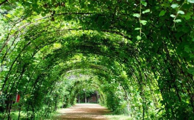 千里葡萄长廊位于和田县巴格其镇,距和田县政府 12km。为改变恶劣的生态环境,和田县从 1960 年代开始,大修葡萄长廊,建成了如今村村贯通、遮天蔽日的千里葡萄长廊。目前,和田县已建成的葡萄长廊约1500km,创造了葡萄栽培史上的奇迹。葡萄长廊犹如条条绿色的长龙蜿蜓在和田县村村落落,有效地改善了农田小气候,现已成为戈壁绿洲的一大景观,是生态观光旅游业的一大亮点。同时葡萄长廊主体建设既节约了有限的土地资源,经济效益又显著。和田县域内葡萄长廊年产葡萄可达 700 吨,年产值可达 140 万元以上。葱绿茁壮而又生机勃勃的葡萄长廊绵延千里,蔚为壮观,徜徉其间,脚下是乡间小路,头顶翡翠般的葡萄,一派田园景色,使人犹入仙境、流连忘返。