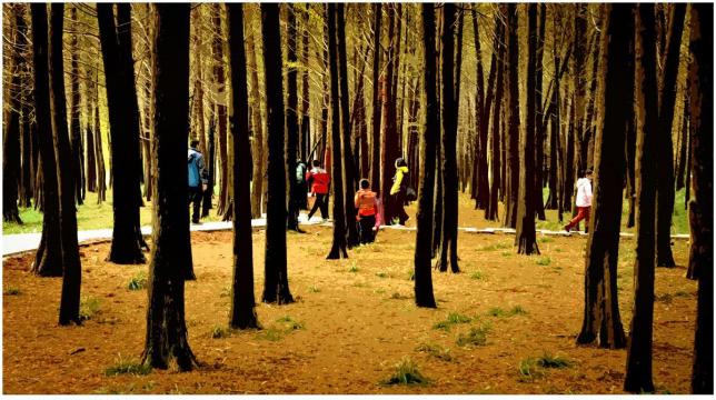 行走在树林之中,脚下厚厚的草坪上时不时出现斑驳的影子,迷幻的色彩,宁静的时空,宛如游走在一幅静止的美丽画卷之中……万山红遍,层林尽染,整齐排列的红杉树,一棵棵高耸入云,在初冬的日子里,红得很彻底。