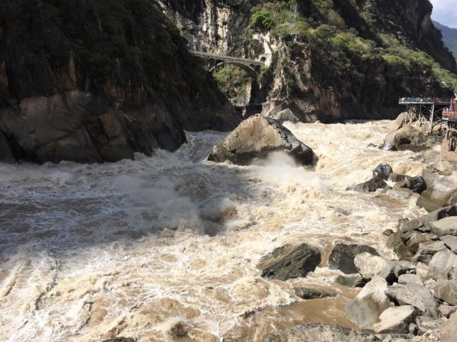 伫立虎跳峡边,水石咆哮震耳欲聋,气度吞天吐地,众多的潜伏江底的虎跳石,阻拦激流涌泻的巨流,喷溅一道一道如翻江倒海般的巨浪,形成白浪冲天的雄奇景观。 虎跳峡徒步线也被誉为“世界十大经典徒步线路之一”,每年吸引着众多户外运动爱好者前来,亲自用脚步去感受虎跳峡的壮观。