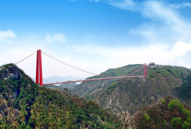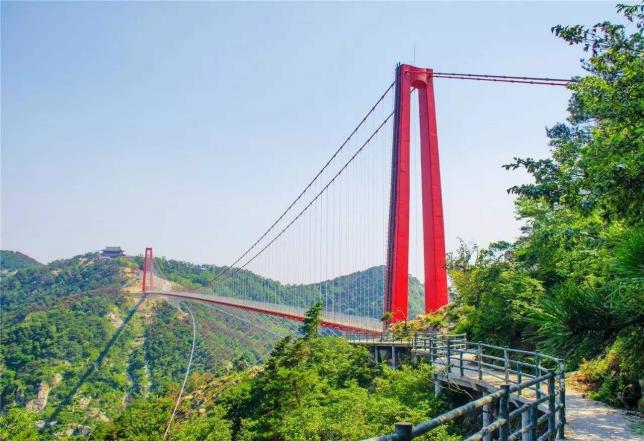 世界第一人行悬索桥,该桥位于费县银座天蒙山景区,总投资约8000万元,桥跨布置采用双塔单跨吊悬索桥,中跨长度420米,边跨长度分别为38米和47.5米,全长505.5米,为世界最长、跨度最大的人行索桥。