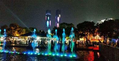 秋水广场位于赣江之滨,和对面的滕王阁隔江相望。开放式的广场上有一座亚洲最大的音乐喷泉,每当夜幕降临时,喷泉在灯光和音乐的配合下变幻出优美的造型,正应了《滕王阁序》中那句“落霞与孤鹜齐飞,秋水共长天一色”。是夜游南昌非常值得推荐的选择之一。白天这里的游人并不多,到了晚上,广场上闪烁的霓虹、散步的情侣、嬉闹的孩子让这里多了几分温馨和浪漫。音乐喷泉一般每天晚上有两场,每场大概25分钟,最高的水柱能达到100多米,很是壮观