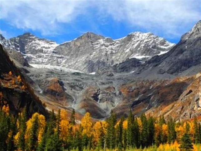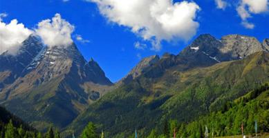 日月宝镜山位于双桥沟中10 公里右侧的山脊上,海拔4800 米,与著名的五色山相邻。它高耸峻拔,崖壁闪亮,峰顶有一巨大岩石呈现长方形,倾斜于东南,岩石间有一条断痕,将岩石一分为二,四季冰雪覆盖宛如悬挂天际的两块明镜。传说这是四姑娘的镇山之宝,在与麦尔都神激战中被摔破,变成此山,故得名。