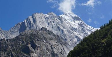 猎人峰位于双桥沟内25 公里处,海拔5360 米,旁邻尖子山。两座高峰摩肩而立,中间一巨大石柱,高达数十米,形如一人屹立。迎朝阳,披彩霞,似有期盼,若有等待。相传,此石柱由猎人变化而成,故名猎人峰,为双桥沟绝境之一。