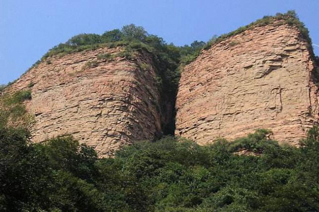 它们郁郁葱葱的彰显着夏日的生机和热情。顺沟向西远远的望去,一道青色的高耸入云的山峰南北横亘在哪里,象一道天然屏障巍峨雄壮,青色的岩壁两旁自西向东又坐落着两座红色的山峰。