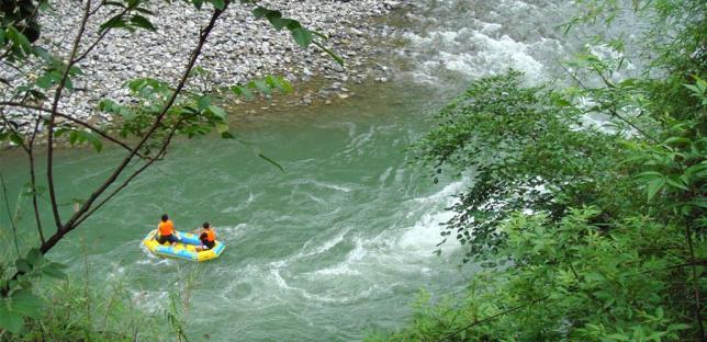 漂流全长约2公里,总落差约30米,起漂点水坝以6米高的落差给驴友们“湿身暖场”,继而钻拱桥,进森林,漂过大小潭坝十余个,周围全是参天大树,或飞速、或缓缓地在森林中穿过。