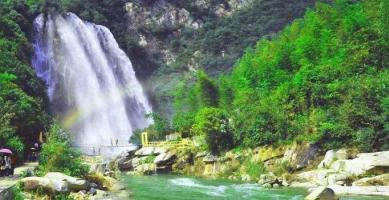 大别山彩虹瀑布风景区,位于安徽省岳西县黄尾镇境内,距岳西县城和霍山县城均为34公里,离济广高速六潜段黄尾出口1.5公里。瀑布倾泻入潭水,积起的水花形成薄薄的水雾,气势磅礴,运气好碰上阳光明媚的日子,就能看见瀑布前的彩虹。