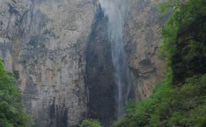 云台天瀑位于泉瀑峡尽头,落差达314米,被誉为“华夏第一高瀑”。远远望去,瀑布上吻蓝天,下蹈石砰,犹如擎天玉柱,宛如白练当空。瀑布上端如同朵朵白云,又如团团棉絮,悠悠飘落,连绵不绝。下端宛如飞花溅玉,至天而降,直落入碧水潭中。急泻而下的瀑布,在水潭中,溅起1米多高的水花,溅起千堆雪,又升起腾腾水雾,把瀑布罩在朦朦的雾中。若雨多的季节气势更为磅礴,山洪暴发时,瀑布像脱缰之烈马,日夜奔腾,声震数里,近听如闷雷轰响,远听似古钟长鸣。
