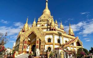 勐焕大金塔座落在云南省德宏州州府-芒市东南部孔雀湖畔的雷牙让山顶。青山绿水间的“勐焕大金塔”光彩夺目,金光灿灿,显得雄伟壮观,是芒市标志性的建筑,也是生活在这里的傣族人民的圣地。传说“释加牟尼”生前转世为金鸡时曾生活于此地。