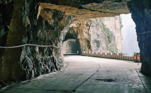 井底村挂壁公路全长1500多米长, 39个窗口,是井底村人历经14年的时间,在悬崖峭壁上艰难地开凿而成的。公路的一侧是坚硬的山体,另一侧就是如刀劈斧削的绝崖峭壁,从隧道洞口向外看风景如画,美不胜收。