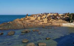 野柳地质公园,位于台湾新北市万里区,野柳是突出海面的岬角(大屯山系),长约1700公尺,由于海蚀风化及地壳运动等作用,造就了海蚀洞沟、蜂窝石、烛状石、豆腐石、蕈状岩、壶穴、溶蚀盘等绵延罗列的奇特景观。