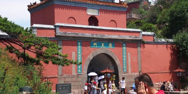 南天门位于泰山十八盘的尽头,是登山盘道顶端,此处双峰夹峙,仿佛天门自开。由下仰视犹如天上宫阙,所以取仙境场所命名。穿过南天门就是泰山山顶,登山行程正式完成.南天门分上下两层。下层为拱形门洞,上镶石匾额“南天门”,两侧镶石刻对联:“门辟九霄仰步三天胜迹,阶崇万级俯临千嶂奇观。”![]()