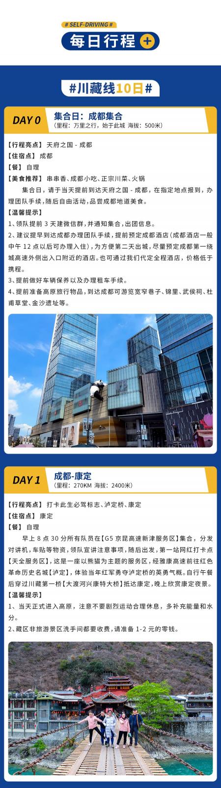 早上8点30分所有队员在【G5京昆高速新津服务区】集合,分发对讲机,车贴等物资,领队宣讲注意事项,随后出发,第一站网红打卡点【天全服务区】,这是一座以熊猫为主题的服务区,经雅康高速前往红色革命历史名城【泸定】,体验当年红军勇夺泸定桥的英勇气概。自行午餐后穿过川藏第一桥【大渡河兴康特大桥】抵达康定,晚上欣赏康定夜景。