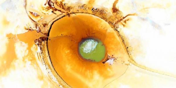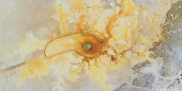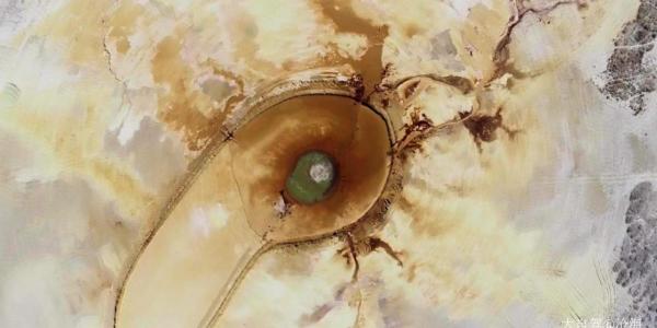 泉眼周围硫磺矿物质长期沉淀,红褐涩、金黄涩、铁锈涩……涩彩斑斓,从上空俯瞰,如同一只画了眼影的眼睛,又像是腾飞的火凤凰。
