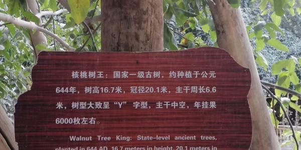 早餐后游览【核桃王树】,树龄超过700年。树高31米,树围近5米,三个人手拉手才能抱拢。树冠庞大、枝杆交错,虽然已经进入老龄期,但是树体仍生长健壮,枝繁叶茂。