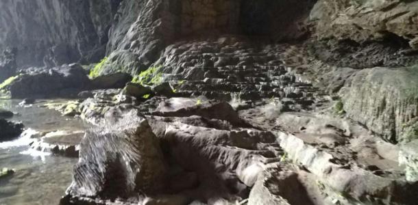 进入百魔洞的第一道洞,感觉这个洞好大啊,扁扁的,里面到处都滴着水,在洞口就有一汪清水,水可见底,水底都是被淹的植物,但仍然好好的在水底生长着。第一道洞已经够大够深的了,只不过石钟乳少了点,总的来说还是不错的,值得一游!