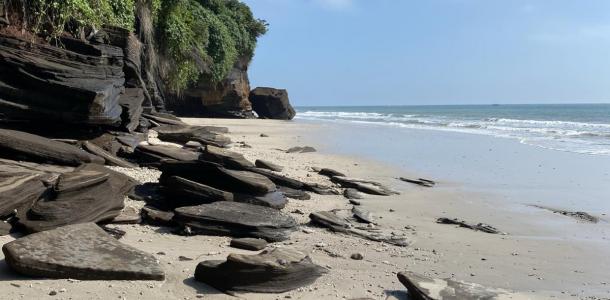 作为中国最大的火山岛,涠洲岛95%以上的地层是火山岩组成,岛上有许多火山喷发的遗迹:南湾火山口、横路山火山口、鳄鱼山火山口、斜阳岛村火山口及斜阳岛婆湾火山口。在波浪、海流、潮汐的侵蚀下,涠洲岛海岸基岩出现海蚀洞、海蚀