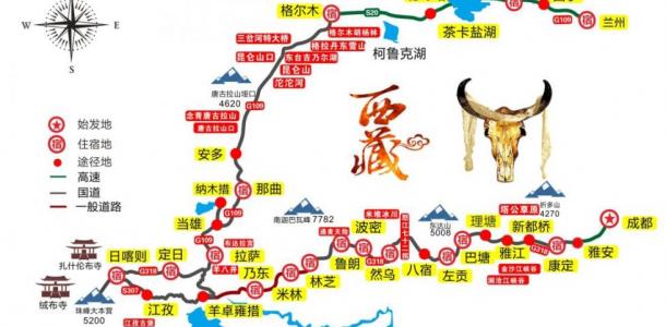 该路线共1天,往返总路程6310.00公里:D1:成都>雅江,车程400公里;D2:雅江>巴塘,车程300公里;D3:巴塘>左贡,车程260公里;D4:左贡>然乌湖,车程280公里;D5:然乌>波密,车程130公里;D6:波密>林芝,车程220公里;D7:林芝>拉萨,车程380公里;D8:拉萨一日游,车程0公里;D9:拉萨>羊湖>日喀则,车程340公里;D10:日喀则>定日,车程230公里;D11:定日>珠峰>拉孜,车程300公里;D12:拉孜>羊八井>当雄,车程480公里;D13:当雄>纳木措>安多,车