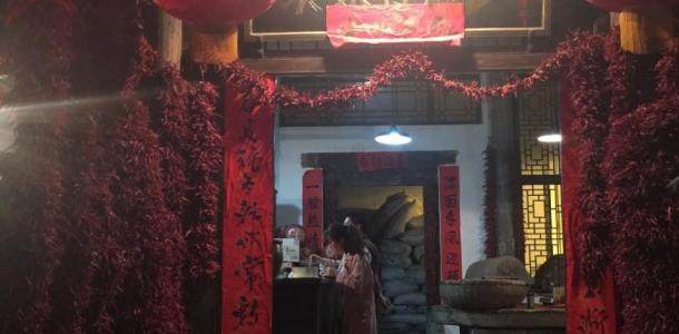 关中的袁家村有些象重庆的磁器口,应该是当地打造的集小吃、地方特色活动为一体的名俗游乐场所。夜间漫布于挂满大红灯笼的村中,吃一碗豆腐脑、看一看张氏皮影的现场制作、坐一坐放着老片子的竹凳茶坊,在那挂满辣椒的门面前、堆积如稻草的手工粉堆中、挂满大小葫芦的唐韵轩内拍拍照,实在很惬意!