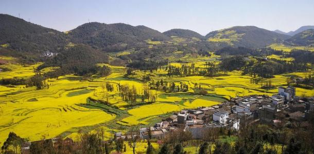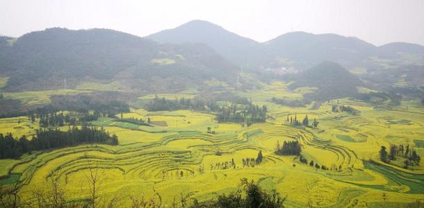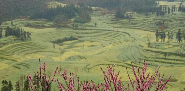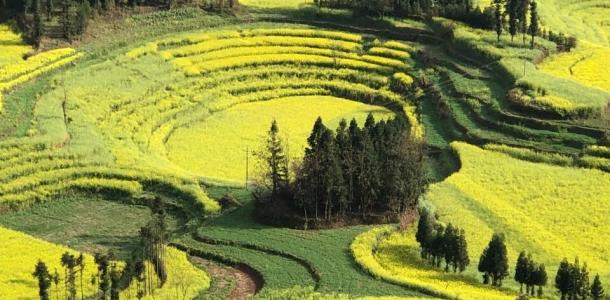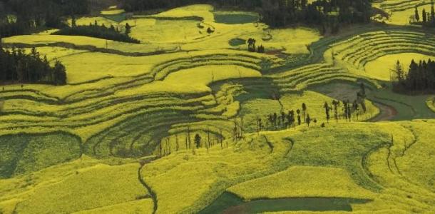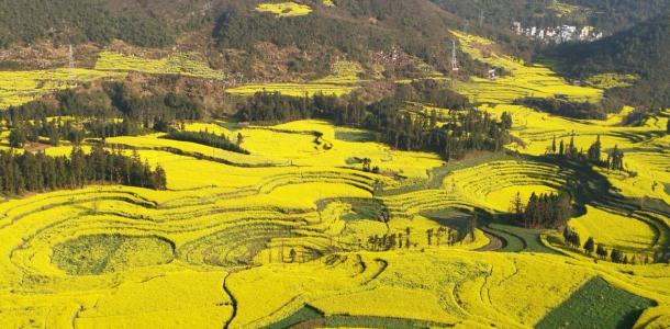 螺丝田位于罗平城的西北,这里的油菜花以同心图案梯田的形式种植,远看仿佛螺丝上的纹路,因而得名。罗平在二月中旬即迎来油菜花海,时间居全国最早。