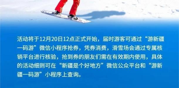 据了解,新疆将以“冬季到新疆来滑雪”为主题,通过“游新疆一码游”微信小程序向疆内外广大游客和雪友发放消费券,预计发放消费券5万余张,分为满100元减50元、满200元减120元两种类型,预计补贴资金可达400万元。活动将于12月20日12时