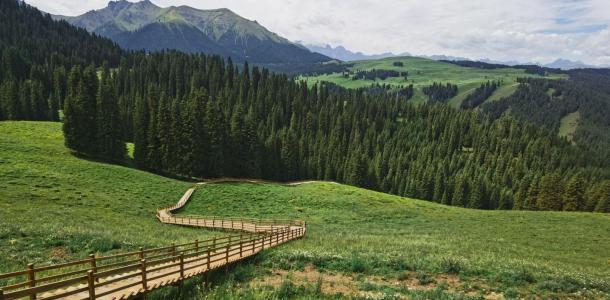 在江布拉克徒步,你将会欣赏到雪山冰川、高山和亚高山草甸草原、中山森林、低山草原等不同的山地景观。形成垂直地带性明显、具有典型的天山景观特色。游客中心-天山麦浪-怪坡-欢乐谷-大峡谷-断桥-黑涝坝游客中心:您可以在此购买景