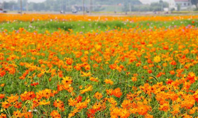 荻浦村的波斯菊、向日葵、马鞭草开的正艳,