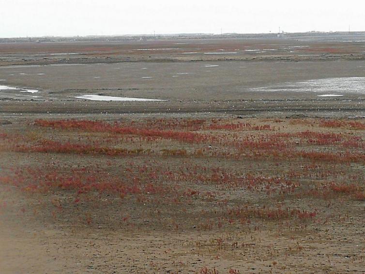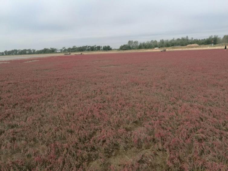 织就红海滩的是一棵棵纤柔的碱蓬草,她每年4月长出地面,初为嫩红,渐次转深,9月由红变紫。