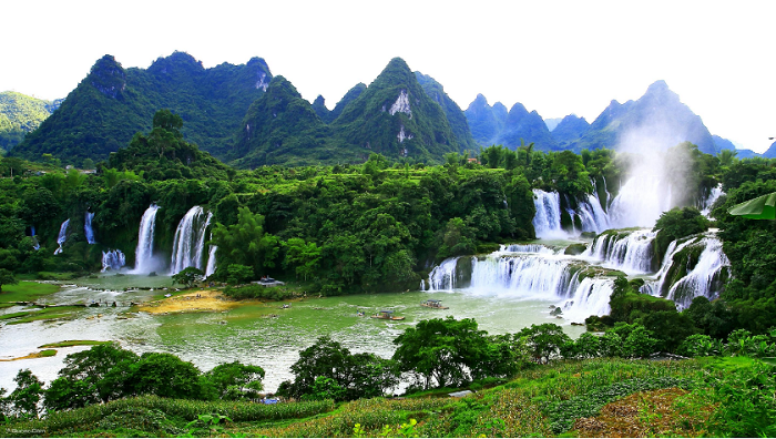 瀑布横跨中国、越南两个国家,是亚洲第一、世界第四大的跨国瀑布(瀑布宽200余米,与越南板约瀑布相连)。瀑布气势磅礴,一波三折,层层跌落,水势激荡,声闻数里。瀑布河水时急时缓,时分时合,迂回曲折于参天古木间;更有花草掩映,百鸟低徊。