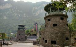 一进剑门关,我看见这里的山每座都像被斧头砍开一样,山上的树木不多,尽是悬崖峭壁,古时的蜀道就是像贴在这些悬崖峭壁上的木头栈道,顺着山壁蜿蜒盘旋。