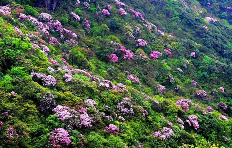 原生态高山杜鹃,没有一花一株是人工移植。五彩杜鹃遍布山脊;深红、粉红、深紫、鹅黄,淡白,色彩斑斓,璀灿成趣。