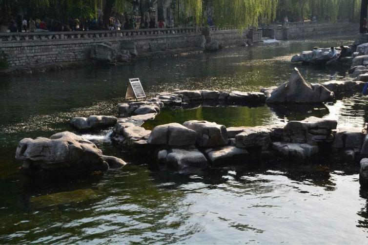 九女泉东邻白石泉,白石泉的泉水清澈见底,如一面明镜。周围有洁白的自然石环绕,形成一个圆圈。白石上摆着的一盆盆金黄的菊花,正在竞相怒放。水底被绿油油的金鱼藻所覆盖,使清澈见底的泉水看上去像是碧绿色的。白石泉的水特别甘美清甜。即使现在已经是深秋时节,可人们依然喜欢到这里来打水。走过白石桥,我们又参观了因“水柱激石、声若虎啸”而得名的黑虎泉和犹如琵琶扬韵的琵琶泉。