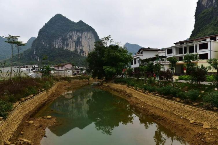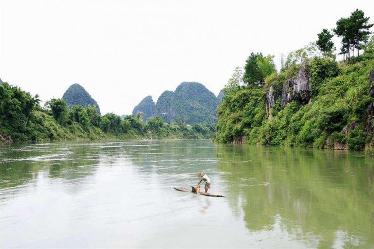 红水河马山百龙滩段蜿挺绵长30多公里,狭窄的河道、突的险滩、满急的河水,碧水幽深,湖光山色,水天一色,宛如画廊。这段在群峰叠峰间缓缓流淌的河流,始终是那样安详、绵长。河岸两边,千峰叠秀,细草如菌,绿树翠竹,朵朵红棉,点点村落。