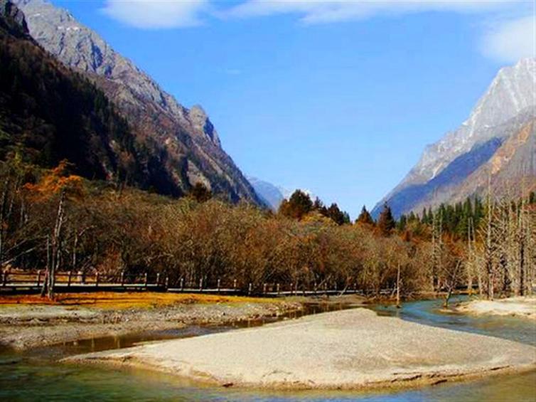 双桥沟全长34.8公里,主要以雪峰、牧场、草地、森林等为主,是四姑娘山最美丽的一条沟。沟内搭建两座木桥,一座由杨柳木搭建而成,俗称杨柳桥;另一座由红杉木搭建而成,俗称便桥。双桥沟由此得名。景区内分三段。前段为阴阳谷、日月宝镜山、五色山等;中段为撵鱼坝,包括人参果坪、沙棘林等;后段为牛棚子草坪和长河滩,内有阿妣山、猎人峰、血筑墙垣等景点。