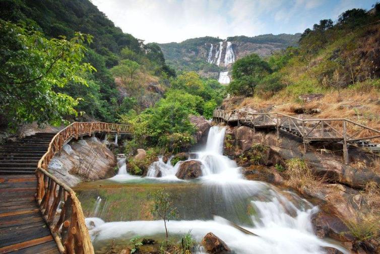 白水寨,因拥有中国内地落差最大的瀑布群而出名。景区内修建有一条长约6.6公里的木栈道,长度为全国之最。游人可沿着木栈道登山,一路前行,一边呼吸森林负氧离子,一边欣赏仙瀑美景。