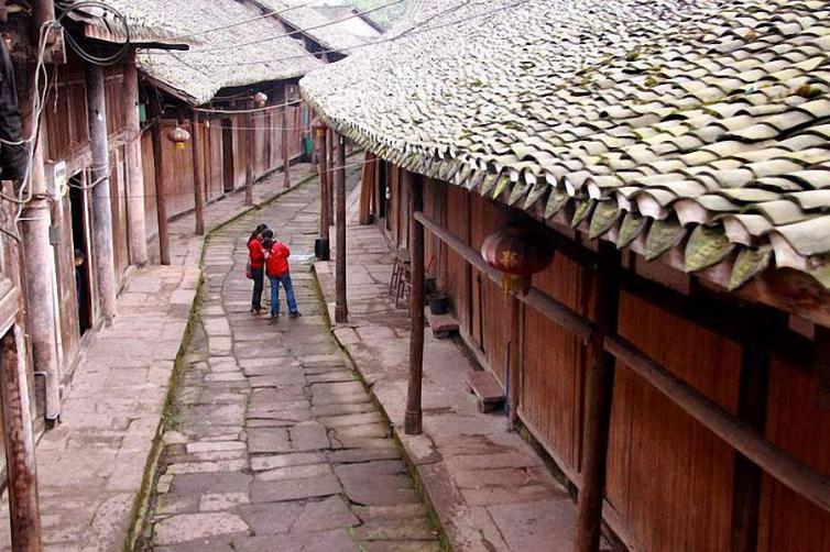 古镇中古街长约300米左右,宽不过2米,仍然还有保存完整的明清风格的川南为数不多的吊脚楼及清道光6年修建的禹王宫,尽管岁月的风雨和历史的重载给街道上顽强的石板路刻上了深深的皱纹,但两旁的木质民居建筑仍能映射出当年的华彩。