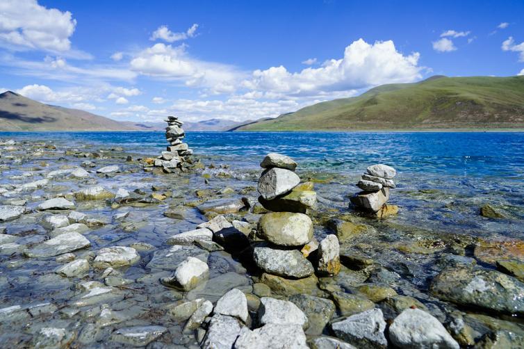 来到湖边,水的颜色突然变成了翠绿色,又仿佛是一块没有一点杂质的翡翠。水面上的蓝色不停地变幻,有时深,有时浅,整个羊湖就像一块巨大的调色板,装下了所有的蓝色。