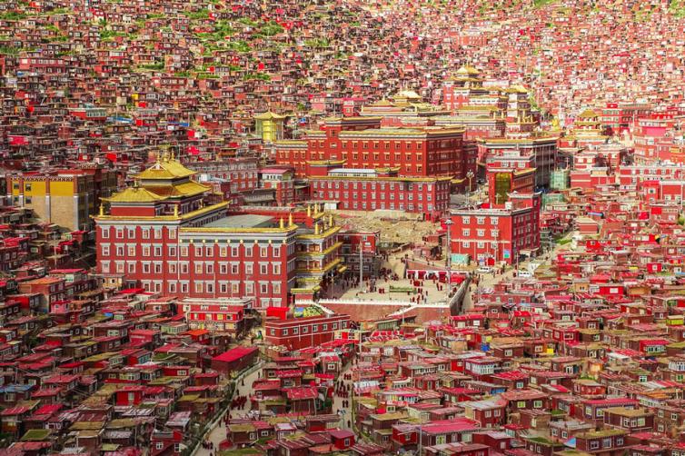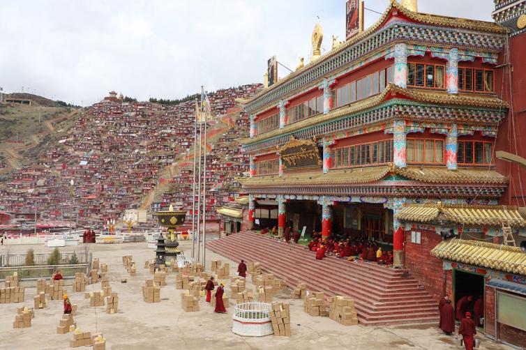 色达佛学院,坐落在四川省甘孜藏族自治州色达县境内向东南方向约20公里处,海拔4000米上。在重重的群山环绕之中,沟里的僧舍,以佛学院的大经堂为中心,密密麻麻搭满了四面的山坡,不计其数的绛红色小木屋,延绵无数,一眼望不到头,场面非常壮观。