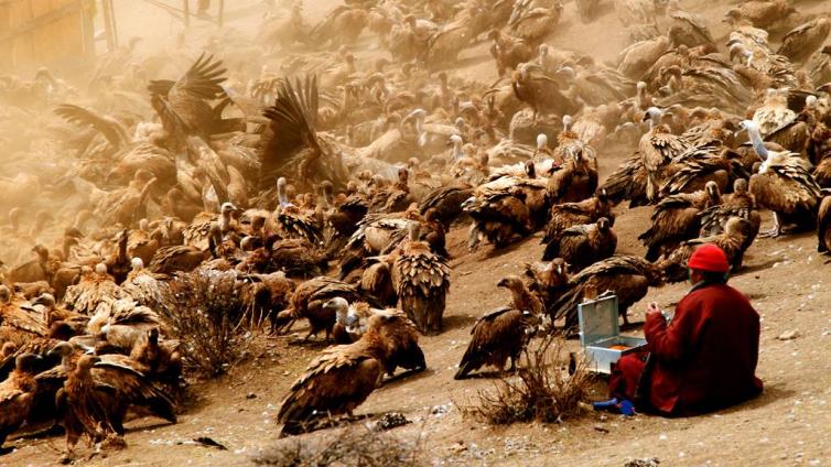 色达天葬台位于佛学院附近的一个半山坡上。 天葬是藏地人一种传统丧葬方式,是指把死者的尸体喂鹫鹰。佛教相信人的灵魂不灭,死后的尸体也只不过是一个皮囊,拿这皮囊喂鹫鹰,是最尊贵的布施,体现了大乘佛教波罗蜜的最高境界—舍身布施。天很蓝,云很白,阳光照耀着雪山, 除了秃鹫早已在这乖巧的等待, 你无法察觉这是天葬的地点。