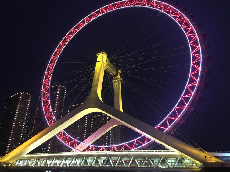 天津之眼全称天津永乐桥摩天轮,位于天津市红桥区海河畔,是一座跨河建设、桥轮合一的摩天轮,就像是桥上的一只眼睛,被誉为“天津之眼”。天津之眼是世界上唯一一个桥上观景摩天轮,是天津的地标之一。