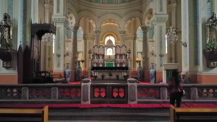 教堂外部用红黄相间花砖砌成,三座呈品字形排列、高耸入云的塔楼上浮盖着绿色铜片,塔楼顶上各有一个青铜十字架。走进教堂,映入眼帘的首先是湖蓝、白色、淡黄构成的内部主色调,给人一种清新的感觉,14根立柱从门口排列到祭台。教堂四周列着一座座精美的教徒铜像,墙壁上则挂着一幅幅记述耶稣受难故事的油画,教堂内还有圣母、耶稣、天使等的彩色塑像。