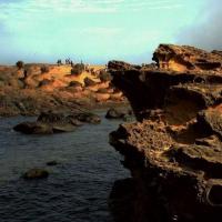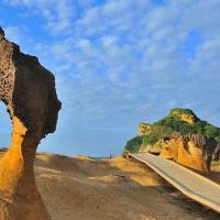 野柳地质公园,位于台湾新北市万里区,野柳是突出海面的岬角(大屯山系),长约1700公尺,由于海蚀风化及地壳运动等作用,造就了海蚀洞沟、蜂窝石、烛状石、豆腐石、蕈状岩、壶穴、溶蚀盘等绵延罗列的奇特景观。