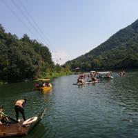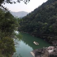 三月去九龙谷国家森林公园游玩,其中九龙谷霞客漂流,就在九龙谷景区内,沿着溪谷走到快到景区的尽头,左岸有一处堆着许多橡皮船的小木屋,就是漂流起点了。最好是雨水较多的时候去,既可以感受漂流的刺激,又可以领略沿途的风景。我8月底去的时候,溪谷里没多少水,溪谷中砌筑了一条固定走向的漂流滑道,漂流点的上游(景区的尽头)有一处瀑布,瀑布流下来的水汇集成一处水潭(湖),有一道水堤将水拦住,漂流要等到下午2点多,才放水,漂流船顺着这条滑道冲下来。