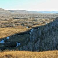 哈乌尔河弯弯曲曲,流成了细水蜿蜒,千回百转的模样,在金光里一片柔美。旁边的一个小村落,为这林间水边添起了一些烟火气。夕阳已经偏移到西侧山头,山的阴影遮住了河的一半,沐浴在金色的余晖里。