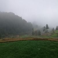加榜梯田位于贵州省黔东南从江县西部月亮山腹地的加榜乡东北面,距县城80公里,好像80公里并不是很远,但是我们开7座车也要3个小时,因为路真的很不好,路很烂,坑很多。其实以前这里不通路,所以梯田发现得很晚,因此没怎么被破坏,现在也没有开发收门票。 我们到山脚时,发现真的如天气预报说的,在下雨,越往山上走,雾气越大,路两边基本上是白茫茫一片。 到了半山,见有一个村寨,有凉亭,也不知道是叫什么,就停下来看梯田,那时候的梯田还在下小雨,雾气升腾,根本看不到多少景色。 雨一会漂来,一会就停了。所以梯田上的雾气也是一下子散去露出漂亮的梯田,一下子变白茫茫一片。 这风景真是飘渺悠然,让你感觉置身于一种绝美的