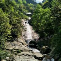 明月山门前的广场做的很漂亮,坐缆车上山80元/每人,建议别坐,因为徒步登山途中景色美不胜收。九级瀑布,最下一级是云谷飞瀑,高50多米,壮观。