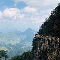 去明月山的当天是阴天,可是山上却是阳光明媚,云层稍厚了点,但依然是那么美。门票是在携程 提前定好的,刷身份证就可以直接进山。先坐了缆车直达山顶,然后徒步走到青云栈道。